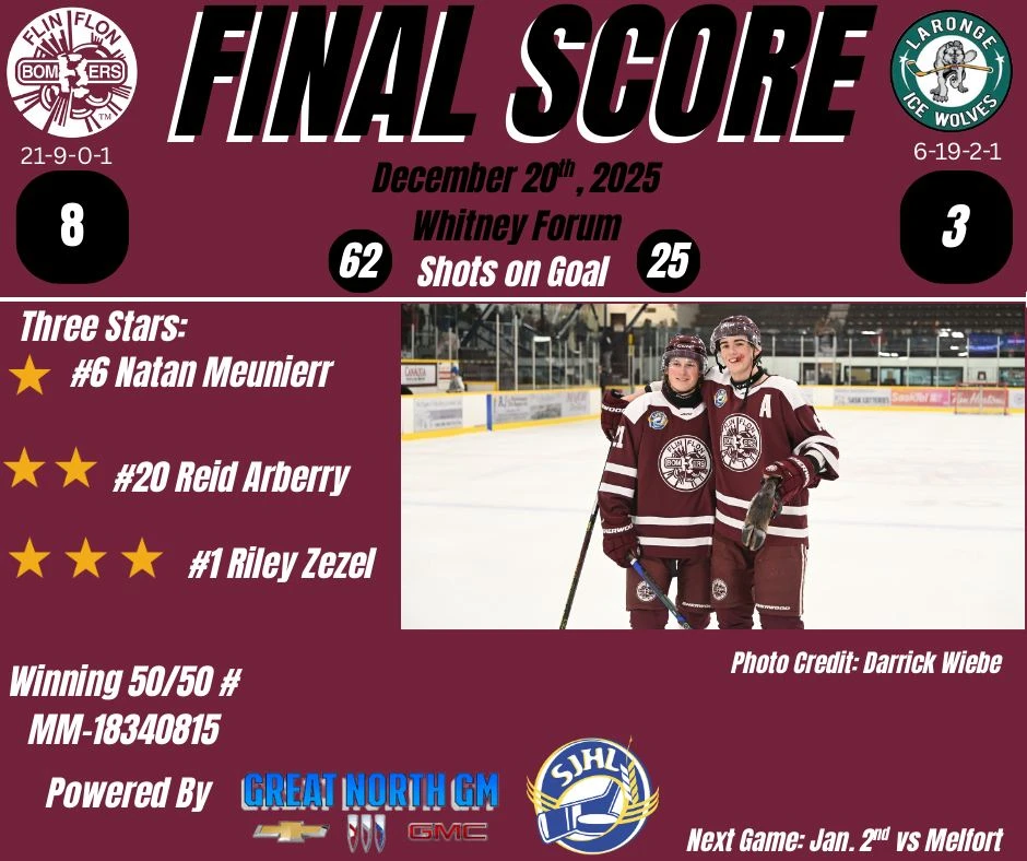 The Flin Flon Bombers closed out 2025 with a couple of convincing wins over the Laronge Ice Wolves on the weekend.
