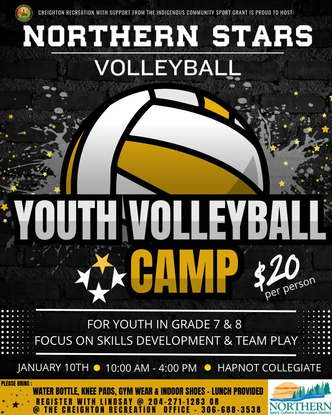 Creighton Recreation in conjunction with Northern Stars Volleyball is holding a Youth Volleyball Camp on Saturday January the 10th at Hapnot Collegiate.