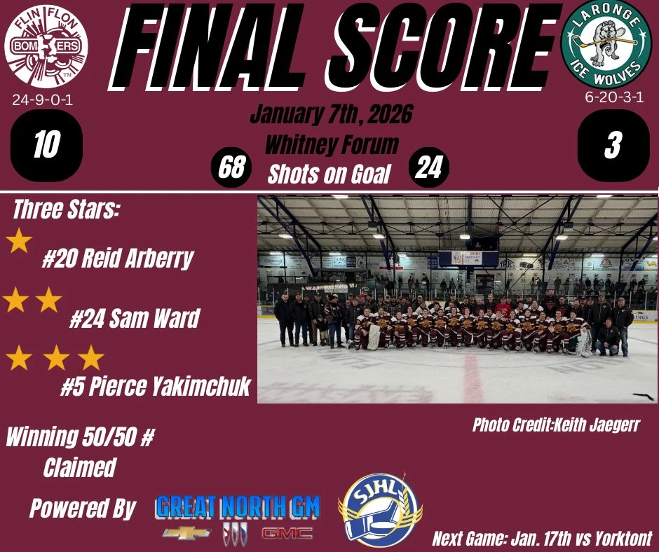 Flin Flon continues to roll along and have won 6 in a row and have given themselves a bit more breathing room for first overall and now lead Weyburn by 5 points for first place.
