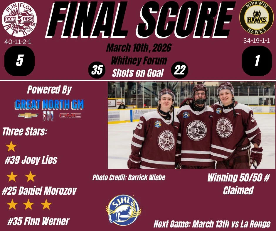 After a tight couple periods last night the Flin Flon Bombers exploded for four goals in the third period to beat the Nipawin Hawks 5 to 1 and picked up their 40th win of the season.