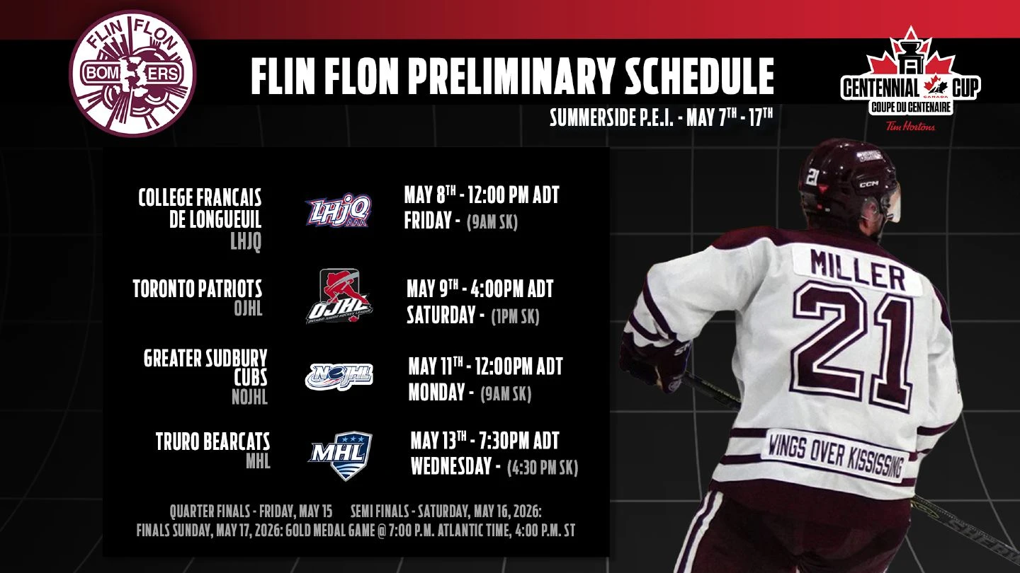 After winning their first SJHL League Championship in 33 years,  the Flin Flon Bombers will head off to their fourth National Championship in Sumerside PEI, May the 7th to the 17th.