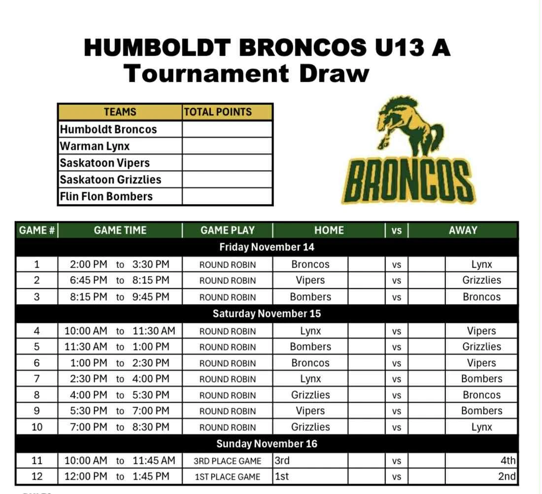 The Bombers will kick off action Friday night as they battle the Broncos at 8:15 pm. The tournament will have all the teams playing each other during the round robin and playoffs are set for Sunday starting at 10am.